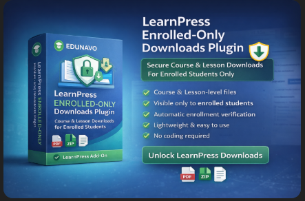 EDUNAVO Course & Lesson Downloads Plugin allows LearnPress instructors to attach downloadable resources to courses and lessons, ensuring only enrolled students can access them.